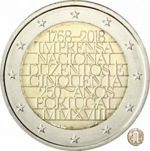 La moneta reca l’iscrizione “1768-2018 IMPRENSA NACIONAL DUZENTOS E CINQUENTA 250 ANOS PORTUGAL MMXVIII”; cifre e lettere si presentano come volumi esposti in una biblioteca. Nella parte inferiore del disco interno sono riportati il nome dell’artista “Eduardo Aires”, sulla sinistra, e il segno della zecca “INCM”, sulla destra. Al poligrafo di Stato sono affidate la pubblicazione della gazzetta ufficiale portoghese, che copre tutta l’attività legislativa del paese, e di opere della massima rilevanza culturale, nonché altre iniziative culturali. Sulla corona esterna compaiono le 12 stelle dell’Unione europea.