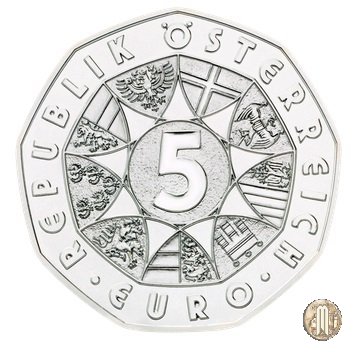 Al centro il valore nominale, attorno gli stemmi delle 9 province. Sul giro la legenda 'REPUBLIK ÖSTERREICH EURO'.