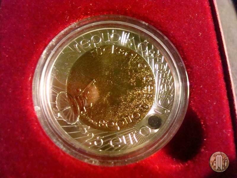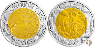 Anno Internazionale dell'Astronomia 2009 e 400° anniversario dell'invenzione del telescopio di Galileo usato nel 1609 per osservare la luna. Lo sfondo mostra una delle prime rappresentazioni della superfice lunare. Nell'anello d'argento anche il telescopio di Newton, l'Osservatorio dell'Abazia Kremsmunster e altri moderni telescopi.