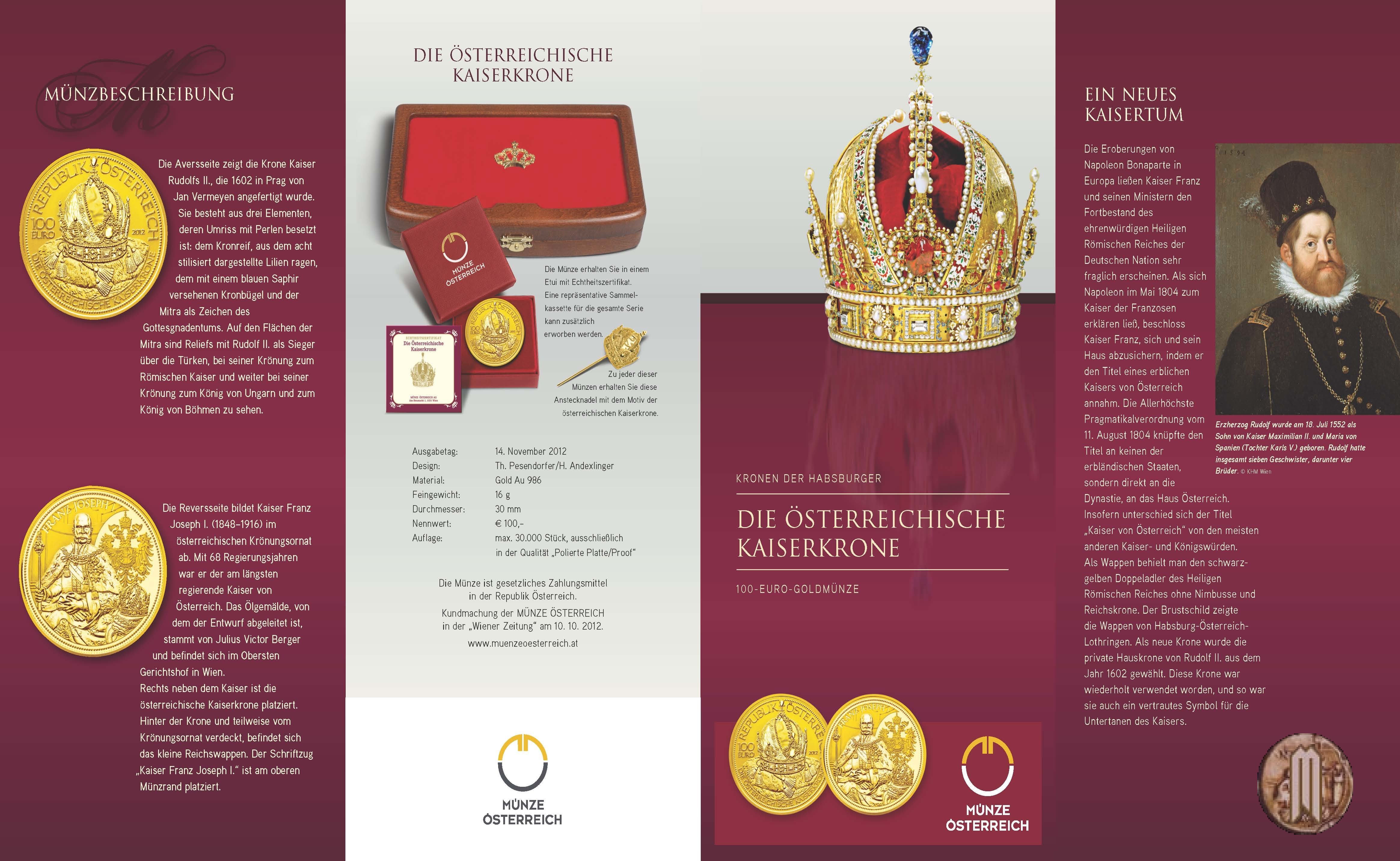 Al centro raffigurazione della corona imperiale fatta per Rodolfo II a Praga nel 1602. Sul giro alto la legenda REPUBLIK ÖSTERREICH, a sinistra il valore nominale (100 euro), a destra l'anno d'emissione (2012), sul giro da sinistra verso il basso la legenda Die Österreichische Kaiserkrone, sul bordo un giro di perle.