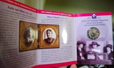 Nel mezzo due ritratti: a sinistra Isala Van Diest, primo medico donna del Belgio, e a destra Marie Popelin, il primo avvocato donna del Belgio; sullo sfondo il simbolo femminile (Venere). Sotto di esse, ad arco, partendo da sinistra, un caduceo, la scritta"I.VAN DIEST", il millesimo di conio "2011", "M.POPELIN" e una bilancia. Sopra, sempre partendo da sinistra, la piuma, segno del Direttore di zecca Serge Lesens, il segno “BE", che identifica il Belgio, e la Testa dell’arcangelo Gabriele con una croce sopra, simbolo della zecca di Bruxelles. Sul bordo esterno 12 stelle a cinque punte rappresentanti l'Unione Europea.