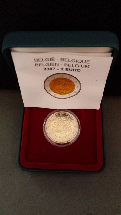 Al centro della moneta il trattato firmato dai sei Stati membri fondatori, sormontato dalla parola "EUROPÆ"; sul fondo la pavimentazione disegnata da Michelangelo di Piazza del Campidoglio a Roma dove sono stati firmati i Trattati il 25 marzo 1957. In basso il millesimo "2007", con, rispettivamente a dx e sx il segno di zecca (Testa dell Arcangelo Michele sormontata da una croce) e il segno del Direttore di zecca Romain Coenen (Bilancia di Romain Coenen); in alto, in una composizione ad arco su due righe, "PACTVM ROMANVM/QVUINQVAGENARIVM"; in basso ad arco "BELGIQUE-BELGIE-BELGIEN". Intorno le 12 stelle rappresentati l'UE. Faccia comune ( NUOVO DISEGNO )
