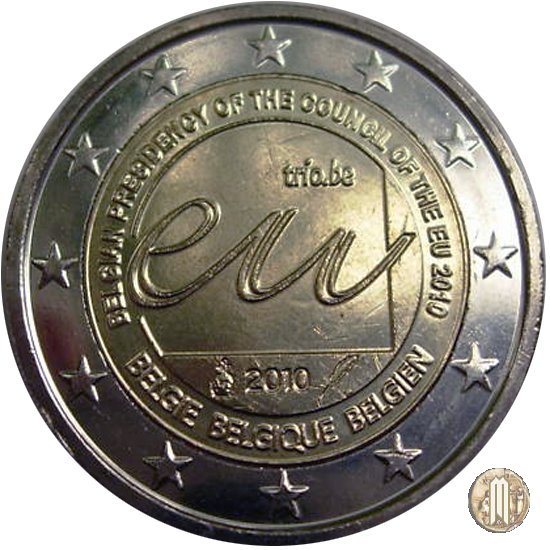 Al centro della moneta la scritta "eu" all'interno di un semicerchio. Sopra la scritta "trio.be" mentre sotto, il millesimo "2010" con a sinistra il segno di zecca (Testa dell Arcangelo Michele sormontata da una croce) e a destra una piuma, segno del Direttore di zecca Serge Lesens (Piuma di Serge Lesens). Intorno al cerchio, sopra, la scritta "BELGIAN PRESIDENCY OF THE COUNCIL OF THE EU 2010" e sotto, sempre ad arco, "BELGIE BELGIQUE BELGIEN". Intorno le 12 stelle simbolo dell'UE. Faccia comune (NUOVO DISEGNO)