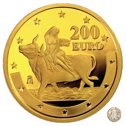 E' rappresentato il mito greco del ratto di Europa, che prende il nome, in alto a destra il valore nominale su due righe, a sinistra il simbolo di zecca, sull'esterno le 12 stelle dell'Unione Europea.