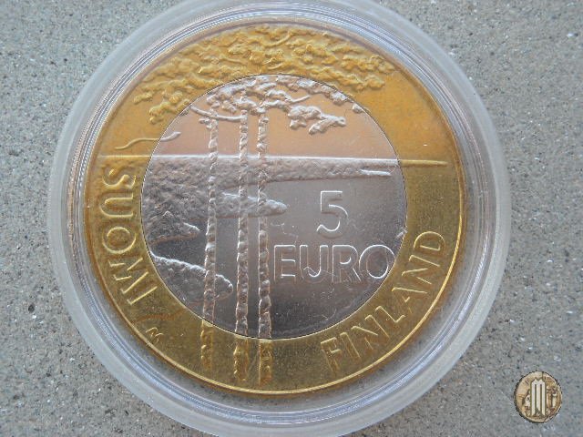 Paesaggio lacustre con tre alberi. Iscrizioni: SUOMI FINLAND 5 EURO