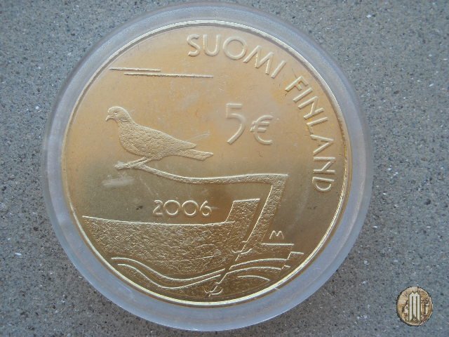 Albero di pino, tipico delle Isole Aland. Iscrizioni: 150 AR - ALANDS DEMILITARISERING Poppa di una barca con timone, con una colomba appoggiata sul braccio del timone stesso. Iscrizioni: SUOMI FINLAND - 5 EURO - 2006