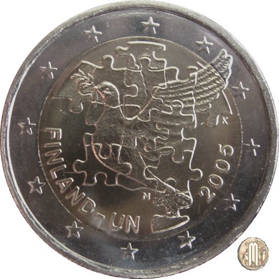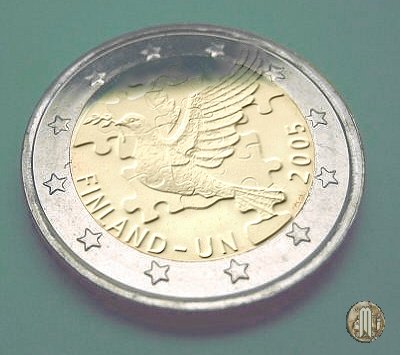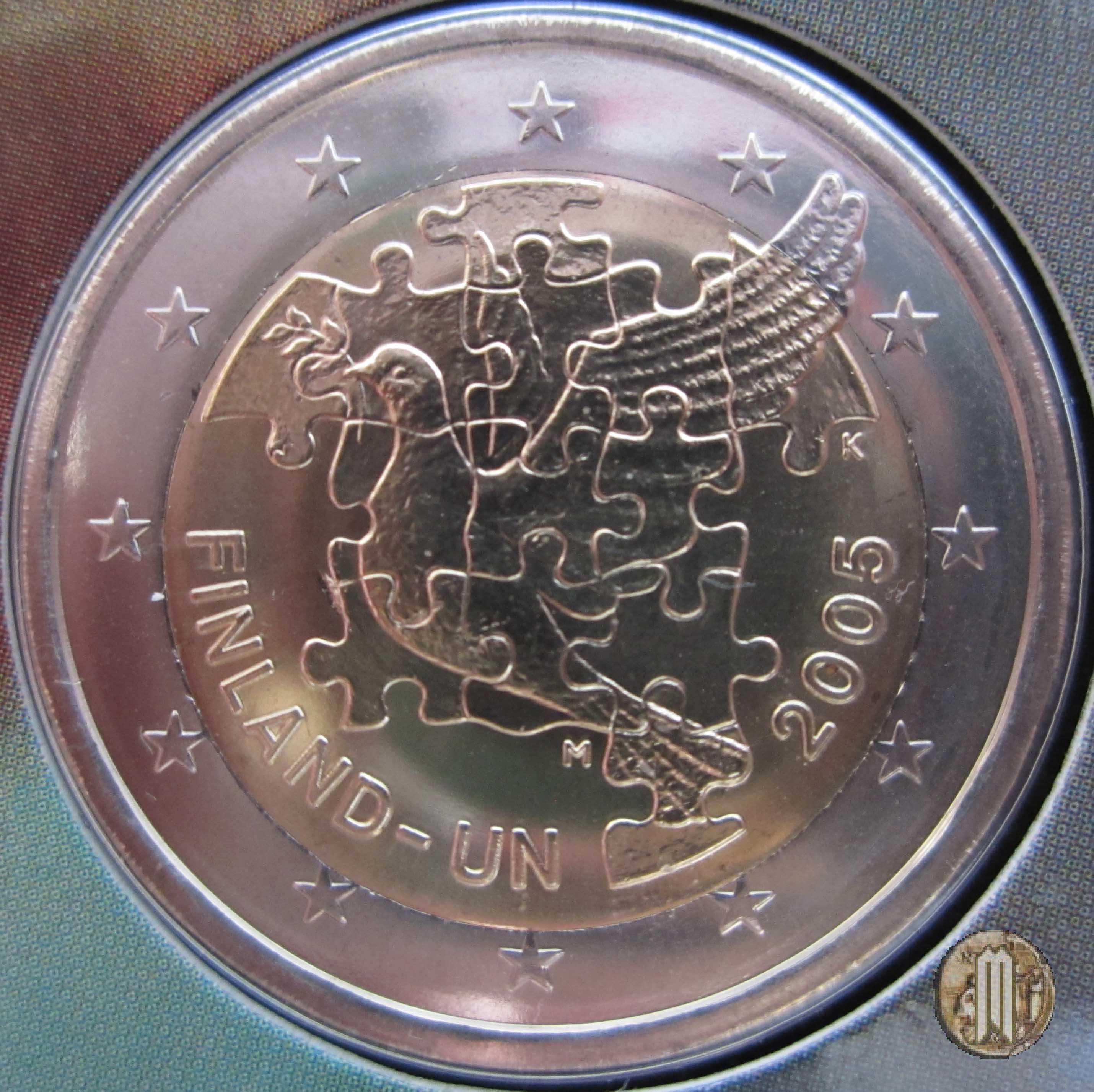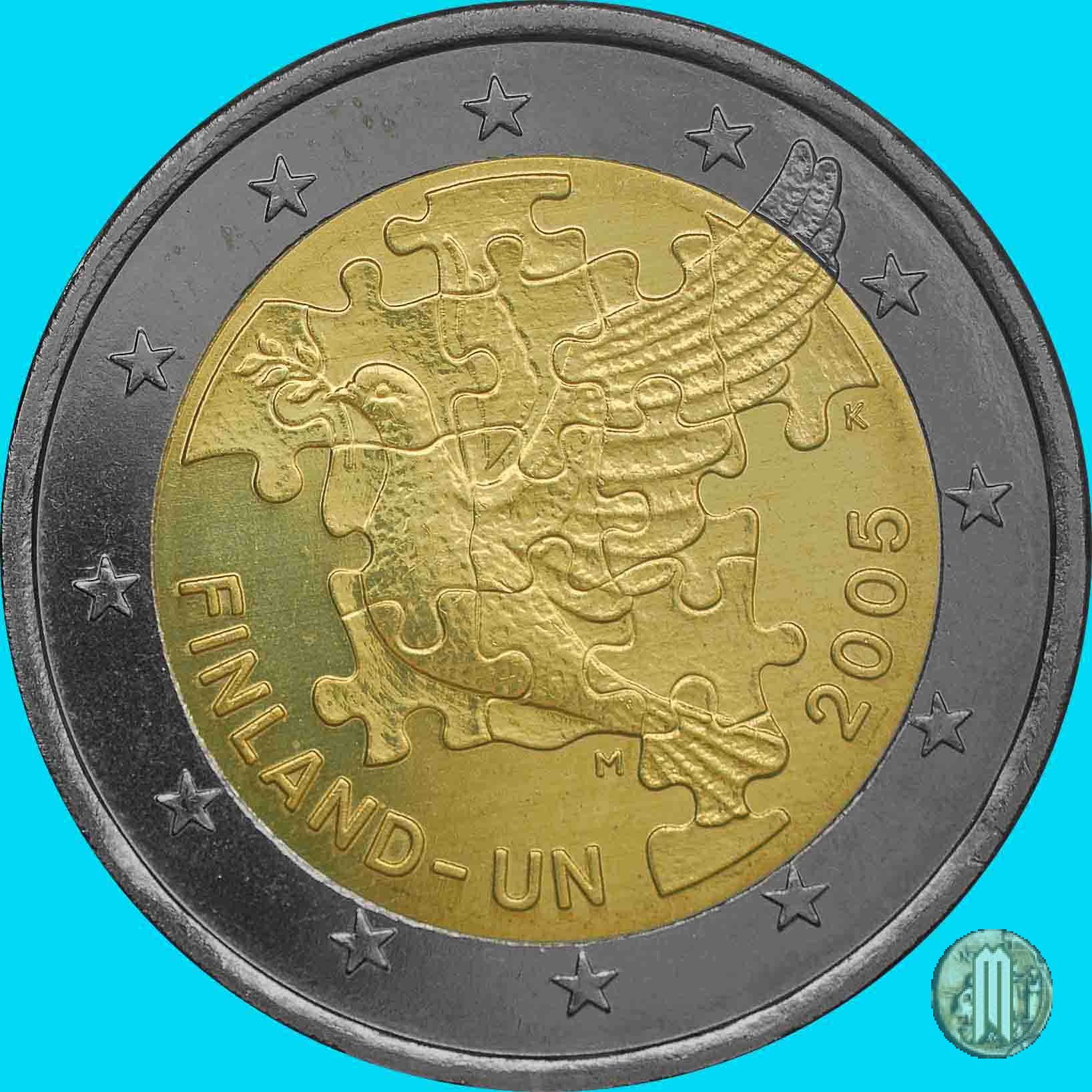 Una colomba della pace composta da tessere di puzzle. Al di sotto della figura, lungo il bordo interno, sono impresse le parole "FINLAND-UN" sulla sinistra, mentre l'anno di conio "2005" è sulla destra; al di sopra dell'anno, è impressa la lettera "K", iniziale dell'incisore Tapio Kettnnen. Il simbolo del Direttore di Zecca Raimo Makkonen è invece sotto la figura della colomba della pace. Le dodici stelle dell'Unione europea sono disposte sul bordo esterno della moneta. 2 EURO su una riga. A dx l'Europa con raffigurate le nazioni dell'UE anteriormente al 1° maggio 2004 con sullo sfondo linee verticali delimitate ciascuna da 2 stelle. destra LL (iniziali dell'autore del bozzetto, Luc Luycx).