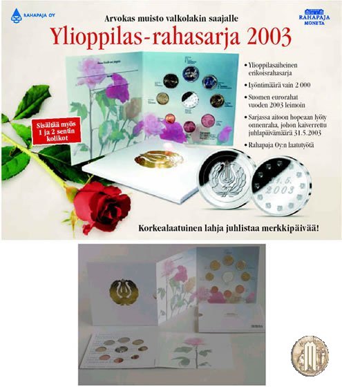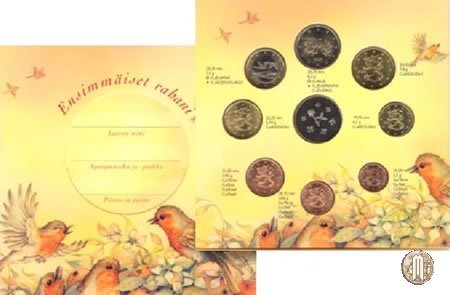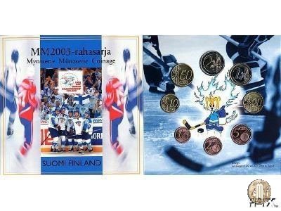 2003 Ensimmäiset (Baby Set - Trenino) Versione: Fior di Conio. Numero di monete: 8. Valori nominali: 2 e 1 Euro; 50, 20, 10, 5, 2, 1 Eurocent (prezzo di emissione in euro: 35,00). 2003 Ensimmäiset (Baby Set - Uccellini) Versione: Fior di Conio. Numero di monete: 8. Valori nominali: 2 e 1 Euro; 50, 20, 10, 5, 2, 1 Eurocent (prezzo di emissione in euro: 25,00). 2003 (Cercatore d'oro) Versione: Fior di Conio. Numero di monete: 8. Valori nominali: 2 e 1 Euro; 50, 20, 10, 5, 2, 1 Eurocent (prezzo di emissione in euro: 24,00). 2003 Jääkiekon MM 2003 (Mondiali 2003 di hockey su ghiaccio) Versione: Fior di Conio. Numero di monete: 8. Valori nominali: 2 e 1 Euro; 50, 20, 10, 5, 2, 1 Eurocent (prezzo di emissione in euro: 25,00). 2003 Ylioppilasset (Diplomati - Maturità) Versione: Fior di Conio. Numero di monete: 8. Valori nominali: 2 e 1 Euro; 50, 20, 10, 5, 2, 1 Eurocent. 2003 Joulupukin kotimaa (Patria di Babbo Natale) Versione: Fior di Conio. Numero di monete: 8. Valori nominali: 2 e 1 Euro; 50, 20, 10, 5, 2, 1 Eurocent (prezzo di emissione in euro: 25,00). | |||||||||||||||