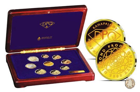 2003 Argento Versione: Fondo Specchio. Numero di monete: 8. Valori nominali: 2 e 1 Euro; 50, 20, 10, 5, 2, 1 Eurocent (prezzo di emissione in euro: 85,00). 2003 Argento e Diamante Versione: Fondo Specchio. Numero di monete: 8. Valori nominali: 2 e 1 Euro; 50, 20, 10, 5, 2, 1 Eurocent (prezzo di emissione in euro: 550,00). 2003 Oro Versione: Fondo Specchio. Numero di monete: 8. Valori nominali: 2 e 1 Euro; 50, 20, 10, 5, 2, 1 Eurocent (prezzo di emissione in euro: 550,00). 2003 Oro e Diamante Versione: Fondo Specchio. Numero di monete: 8. Valori nominali: 2 e 1 Euro; 50, 20, 10, 5, 2, 1 Eurocent. | |||||||||||||