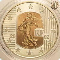 Al centro, in oro: la Seminatrice sullo sfondo di un sole nascente. Affianco, in argento: anno di emissione, lettere RF. In circolo, in argento: 12 stelle, linee verticali, a destra, e orizzontali, a sinistra. Al centro: carta con stati EMU con semicorona d'alloro, sormontati dal valore facciale e da dodici stelle. In alto in circolo, legenda LIBERTÉ - ÉGALITÉ - FRATERNITÉ.