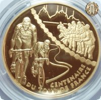 In alto a destra rappresentazione altimetrica di una tappa e pubblico; a sinistra rappresentazione di ciclisti in salita. In basso la didascalia CENTENAIRE DU TOUR DE FRANCE. Al centro il logo della manifestazione Le Tour de France, ai cui lati i due segni di zecca. In basso valore facciale (centrato), data (a sinistra) e lettere RF (a destra) sovrimpressi ad una porzione satinata; in alto la legenda LIBERTÉ - ÉGALITÉ - FRATERNITÉ.