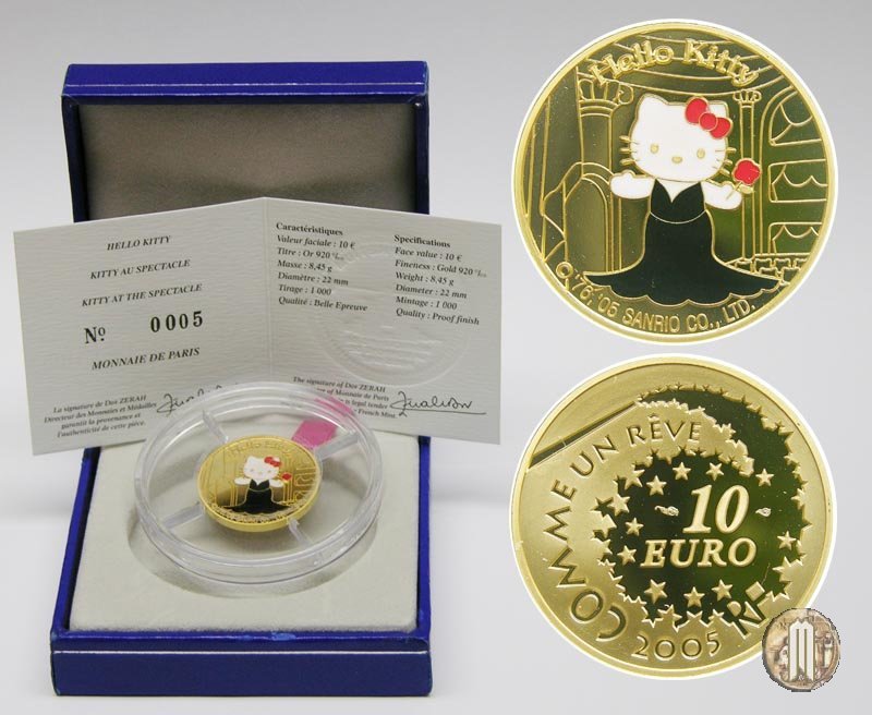 Al centro Hello Kitty in abito da opera, colorata; sullo sfondo particolare stilizzato della Garnier Opera; in alto didascalia Hello Kitty, in basso e piccolo, legenda: ©'76,'05 SANRIO CO.,LTD.