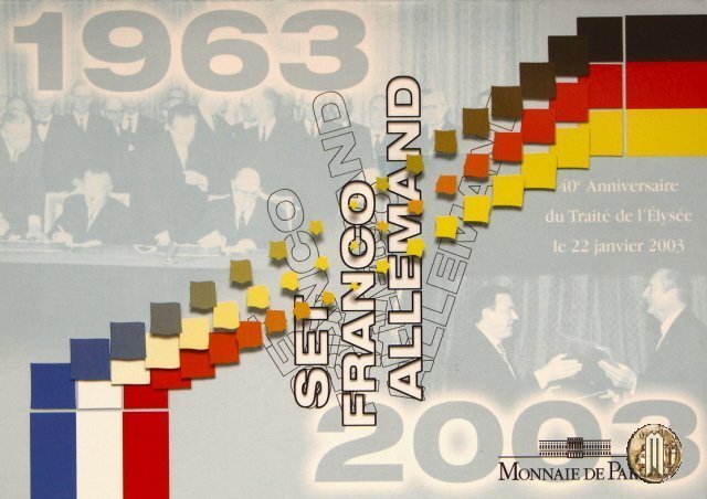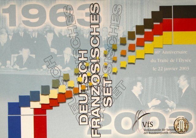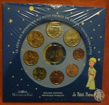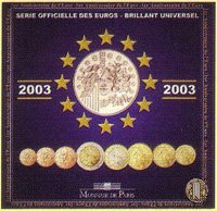 2003 La série officielle et complete des euros (La serie ufficiale e completa in euro) Versione: Fior di Conio. Numero di monete: 8. Valori nominali: 2 e 1 Euro; 50, 20, 10, 5, 2, 1 Eurocent (prezzo di emissione in euro: 27,00). 2003 Les anniversaire de l'Euro (L'anniversario dell'Euro) Versione: Fior di Conio. Numero di monete: 8. Valori nominali: 2 e 1 Euro; 50, 20, 10, 5, 2, 1 Eurocent (prezzo di emissione in euro: 27,00) 2003 La série de monnaies du petit prince en euros - collection 2003 (La serie di monete in euro del piccolo principe - collezione 2003) Versione: Fior di Conio. Numero di monete: 8. Valori nominali: 2 e 1 Euro; 50, 20, 10, 5, 2, 1 Eurocent (prezzo di emissione in euro: 37,00). 2003 Série souvenir de euros francaises - Collection 2003 (Serie turistica di euro francesi - collezione 2003) Versione: Fior di Conio. Numero di monete: 8. Valori nominali: 2 e 1 Euro; 50, 20, 10, 5, 2, 1 Eurocent (prezzo di emissione in euro: 37,00). 2003 Set Franco Alemand (Amicizia franco-germanica) Versione: Fior di Conio. Numero di monete: 8. Valori nominali: 2 e 1 Euro; 50, 20, 10, 5, 2, 1 Eurocent. | |||||||||||