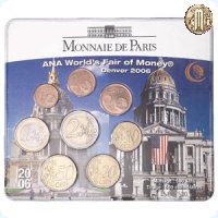Tiratura 500 pz Qualità : Brillant Universel Comprende i pezzi da 1c-2c-5c-10c-20c-50c-1euro-2euros al millesimo 2006, edizione limitata a 500 esemplari Confezione in Blister celebrativa Dell' "ANA" World Fair of Money tenutasi a DENVER | |||||||||