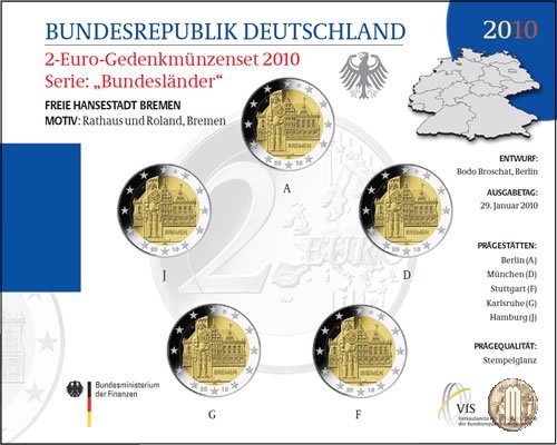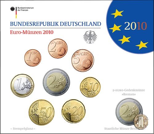 2010 (A, D, F, G, J) Versione: Fior di Conio. Numero di monete: 9. Valori nominali: due volte 2 e una volta 1 Euro; 50, 20, 10, 5, 2, 1 Eurocent (prezzo in euro per singola divisionale: 12,00). 2010 Bundesländerserie: Bremen - Rathaus und Roland (Serie dei Länder: Brema - Municipio e Roland) Versione: Fior di Conio. Numero di monete: 5. Valori nominali: cinque volte 2 Euro (prezzo in euro per singola divisionale: 16,00). 2010 Deutsche Post (Poste Germaniche) Versione: Fior di Conio. Numero di monete: 9. Valori nominali: due volte 2 e una volta 1 Euro; 50, 20, 10, 5, 2, 1 Eurocent. | |||||||||