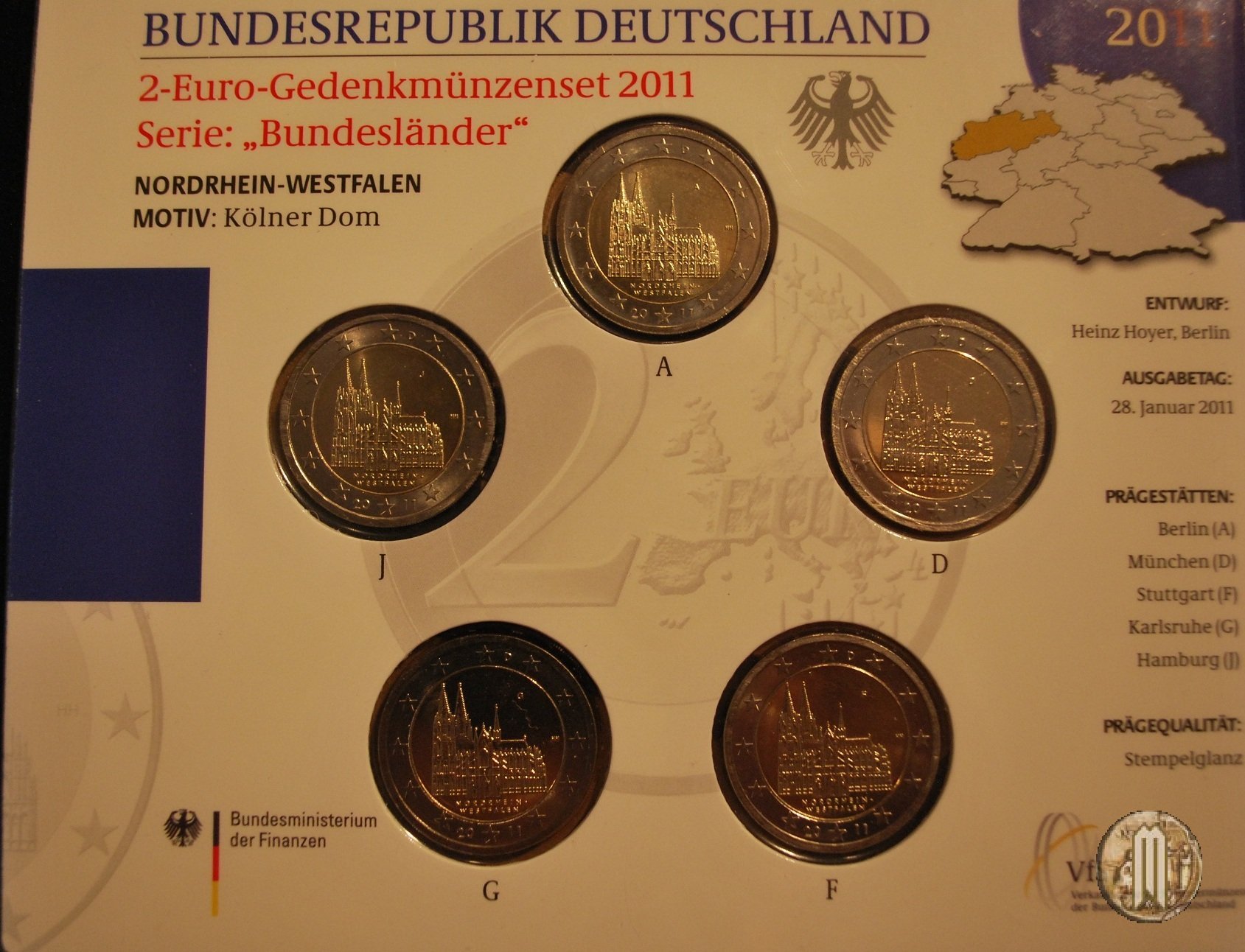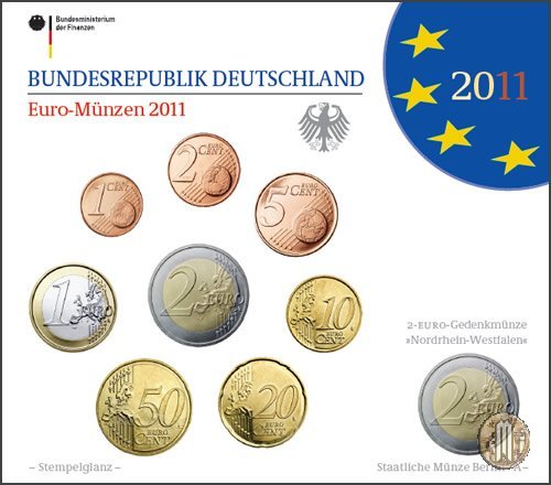 2011 (A, D, F, G, J) Versione: Fior di Conio. Numero di monete: 9. Valori nominali: due volte 2 e una volta 1 Euro; 50, 20, 10, 5, 2, 1 Eurocent (prezzo in euro per singola divisionale: 12,00). 2011 Bundesländerserie: Nordrhein-Westfalen - Kölner Dom (Serie dei Länder: Reno del Nord-Vestfalia - Duomo di Colonia) Versione: Fior di Conio. Numero di monete: 5. Valori nominali: cinque volte 2 Euro (prezzo in euro per singola divisionale: 16,00). 2011 Deutsche Post (Poste Germaniche) Versione: Fior di Conio. Numero di monete: 9. Valori nominali: due volte 2 e una volta 1 Euro; 50, 20, 10, 5, 2, 1 Eurocent. | |||||||||