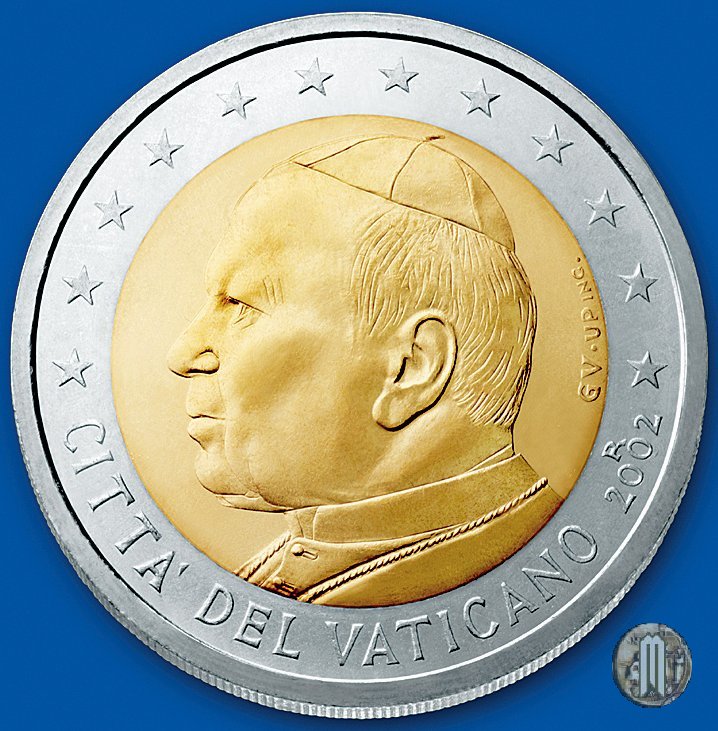 Al centro il ritratto di Giovanni Paolo II rivolto a sinistra. A destra, ad arco, la scritta "GV • UP INC." ad indicare lo scultore e l'incisore della moneta. Intorno, nella metà superiore, le 12 stelle simbolo dell'UE e "CITTA' DEL VATICANO", il simbolo di Zecca "R" e il millesimo di conio nella metà inferiore. Faccia comune