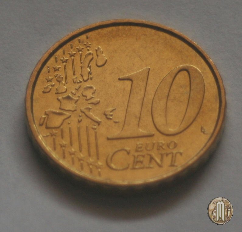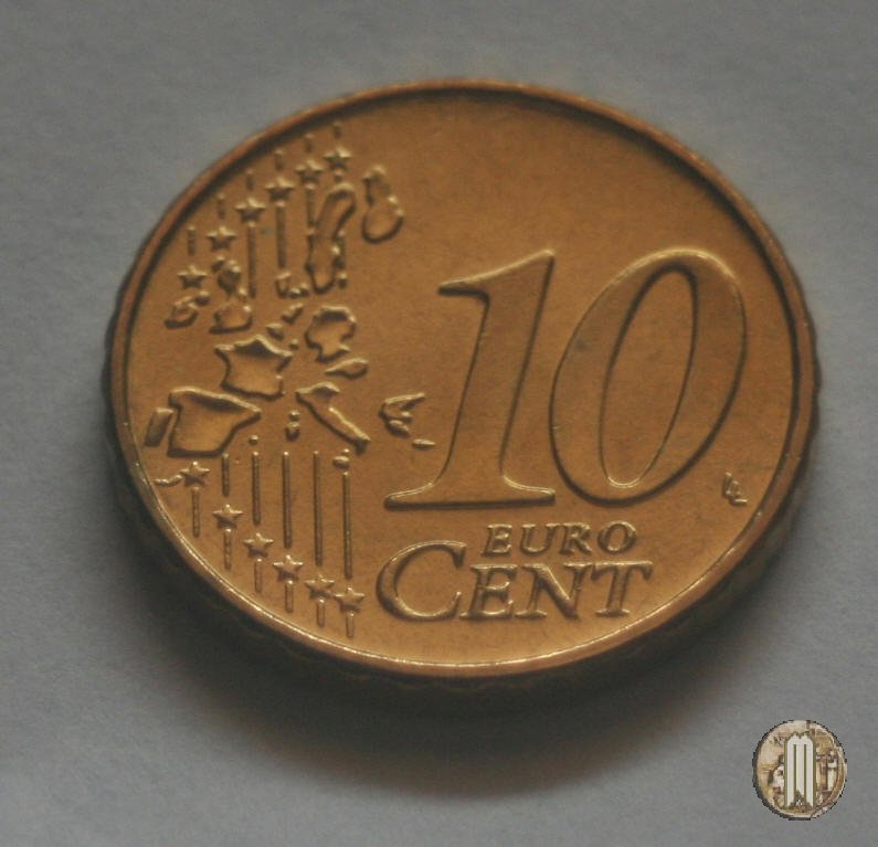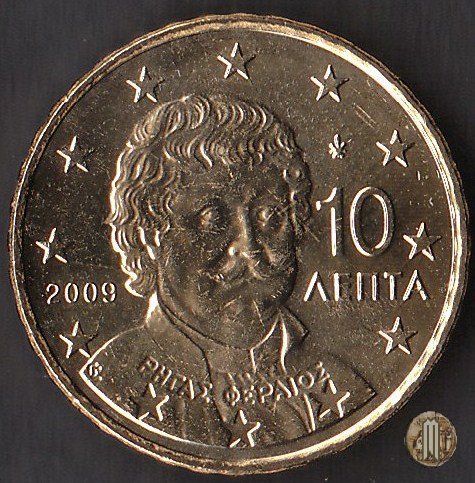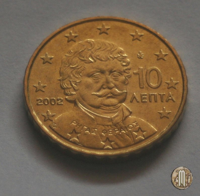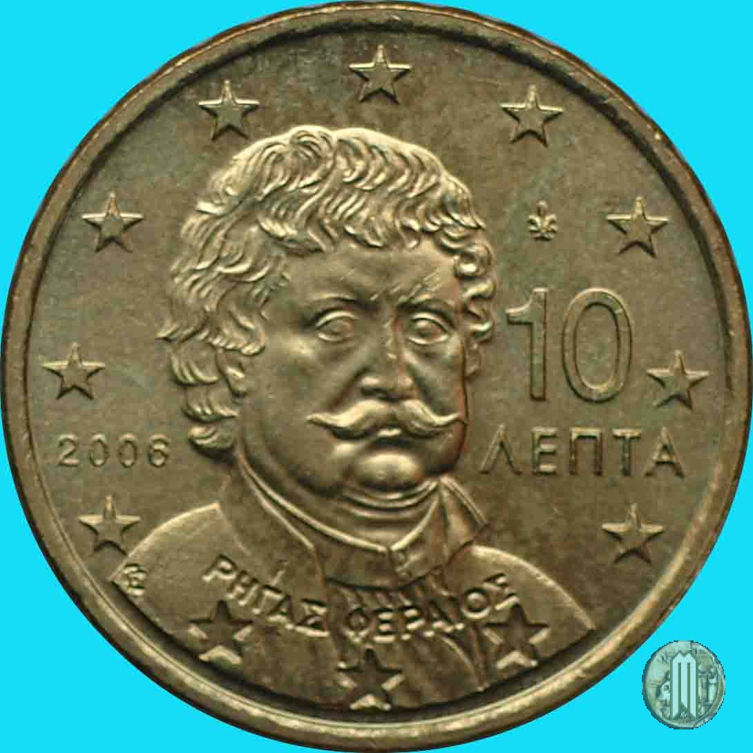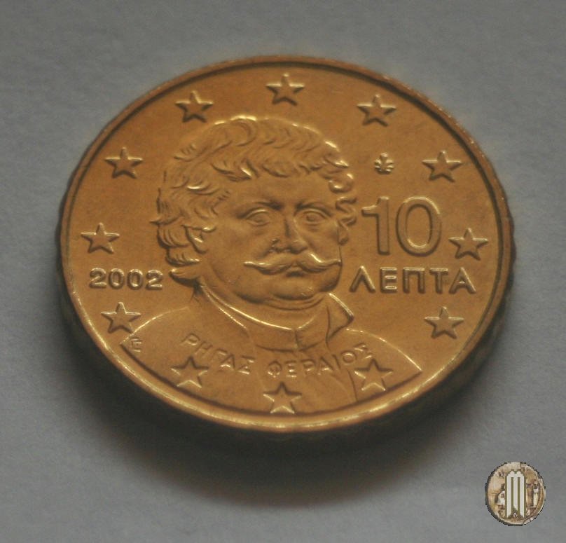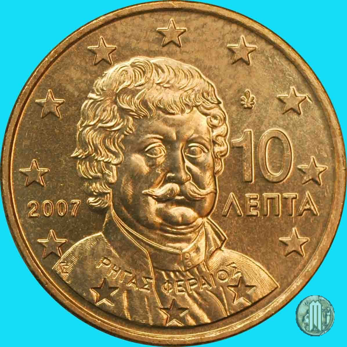 Ritratto di Rigas Fereos (1757-1798), precursore illuminista greco. Fu sostenitore della Confederazione Balcanica ed il primo a prevederne la liberazione. Sulla sinistra il millesimo, sulla destra il segno di zecca, l'Anthemion (un fiore rappresentato in forma stilizzata) e il valore "10" con sotto "ΛEΠTA" (LEPTA); in basso sul busto di Fereos "PHΓAΣ ΦEPAIOΣ" e la firma dell'incisore "ΓΣ" Georgios Stamatopoulos. Intorno le 12 stelle simbolo della UE. Se la zecca è Parigi nella stella a ore 8 ci sarà una "F". Faccia comune - dal 2007 nuova faccia comune.