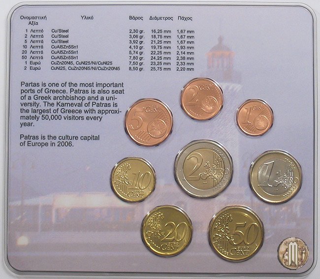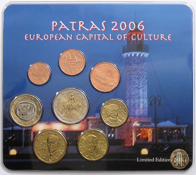 Folder emesso dalla zecca Greca per commemorare Patrasso 2006 "Capitale Europea della Cultura". Il folder contiene le 8 monete destinate alla circolazione in versione FDC. La tiratura è limitata alle 500 copie.