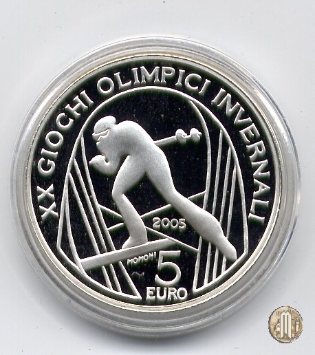 In primo piano rappresentazione del pittogramma della manifestazione Olimpica Torino 2006, relativo alla disciplina dello sci di fondo con composizione di elementi grafici stilizzati, al centro, tra la figura, l'anno di emissione «2005»; il nome dell'autore «MOMONI» ed il valore «5 EURO» disposto su due righe; in tondo «XX GIOCHI OLIMPICI INVERNALI».