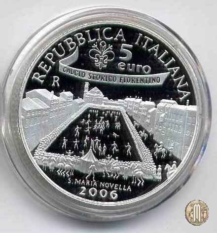Libera interpretazione di una rappresentazione del gioco del calcio in piazza Santa Maria Novella in Firenze (XVII sec.); in tondo la legenda «REPUBBLICA ITALIANA» e sotto il giglio fiorentino e «5 euro». Al centro, in primo piano, all'interno di un nastro, «CALCIO STORICO FIORENTINO»; a sinistra «R»; in basso, in posizione centrale, «S. MARIA NOVELLA» e l'anno di emissione «2006».