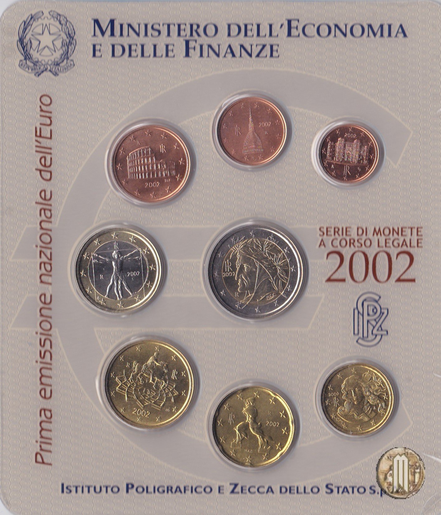 2002 Versione: Fior di Conio. Numero di monete: 8. Valori nominali: 2 e 1 Euro; 50, 20, 10, 5, 2, 1 Eurocent (prezzo di emissione in euro: 20,00). | |||||||||
