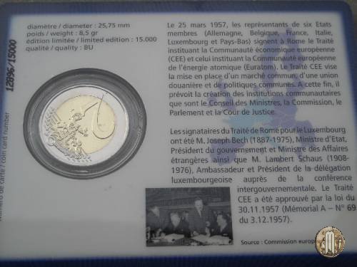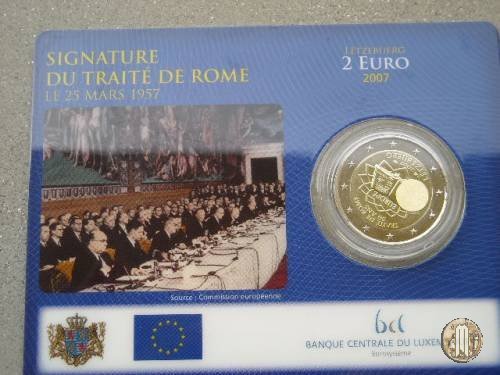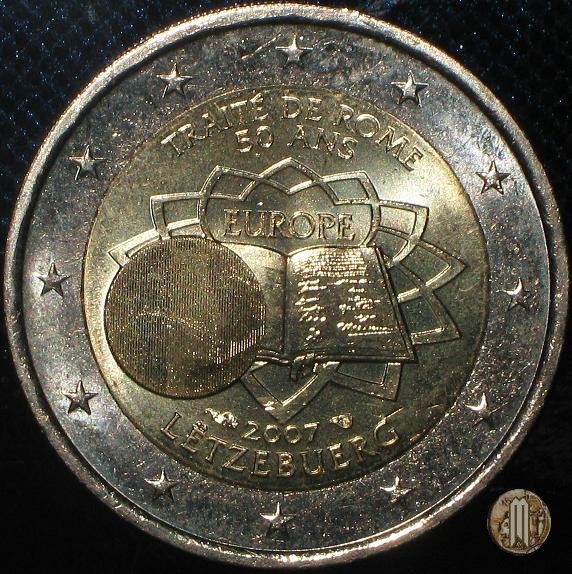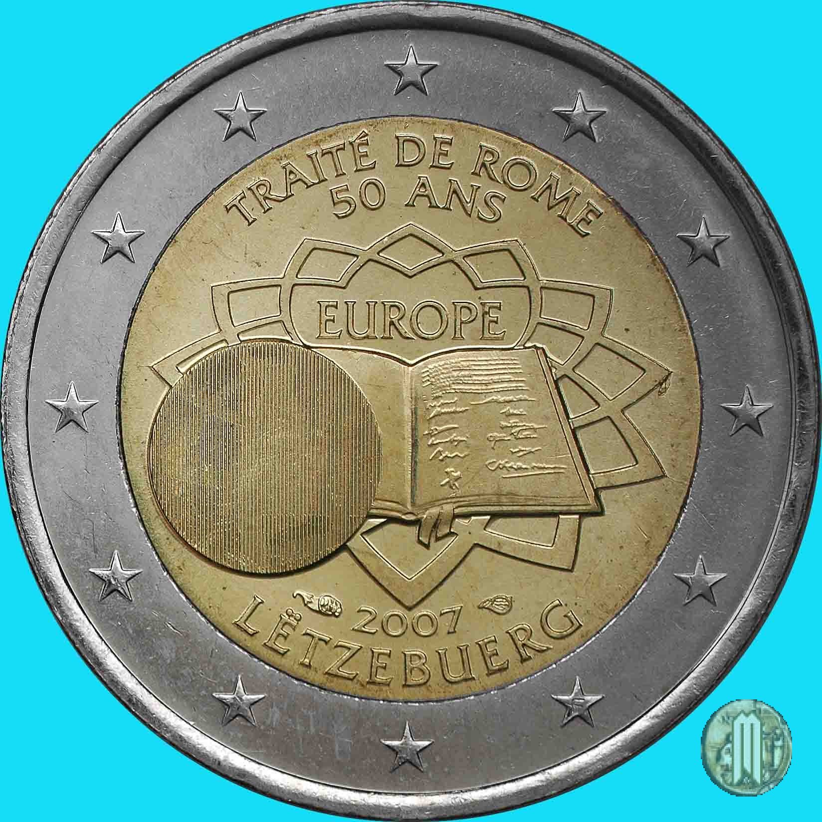 Al centro della moneta il trattato firmato dai sei Stati membri fondatori, sormontato dalla parola "EUROPE"; sul fondo la pavimentazione, disegnata da Michelangelo, di Piazza del Campidoglio a Roma dove sono stati firmati i Trattati il 25 marzo 1957. In basso, il millesimo di conio "2007" con rispettivamente a sx e dx il segno di zecca parigino (la cornucopia) e il segno del direttore Hubert Larivière (un corno); sotto la scritta "LËTZEBUERG". In alto, su due righe, "TRAITÉ DE ROME/50 ANS". Allinterno della stella, che corrisponde alle ore 5, è presente la "F" identificativo della Francia. A sinistra tra il libro e una parte della Piazza è inserito un ologramma che, a seconda di come lo si guarda fa in modo che completa il disegno o lascia vedere il profilo del Granduca Henri.