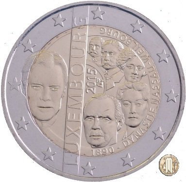 Nella parte sinistra della moneta è raffigurato sua Altezza Reale il Granduca Henri; a destra, in forma circolare e in ordine cronologico di ascesa al trono, sono raffigurati, in primo piano, le Loro Altezze Reali i Granduchi Adolfo (1890-1905) e Guglielmo IV (1905-1912), le Granduchesse Maria-Adelaide (1912-1919) e Carlotta (1919-1964) e il Granduca Giovanni (1964-2000); al centro in verticale la scritta "LUXEMBOURG", che invade in alto e in basso la corona esterna, e l'anno di emissione "2015". Alla destra del disegno ad arco la scritta "1890 - DYNASTIE NASSAU-WEILBOURG". Sul bordo esterno 12 stelle a cinque punte rappresentanti l'Unione Europea faccia comune
