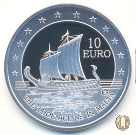 Al centro nave fenicia a remi. "10 EURO" • Sul perimetro: 12 stelle , "THE PHOENICIANS IN MALTA" , logo Europa Star Programme.