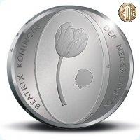 Al centro riproduzione di una moneta ruotata con bordo in evidenza dove è inserito il segno di zecca, al suo interno raffigurazione di un tulipano con fiore aperto, alla sua destra ritratto della regina Beatrice. Sul giro a destra la legenda DER NEDERLANDEN sul giro a sinistra BEATRIX KONINGIN.