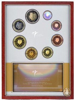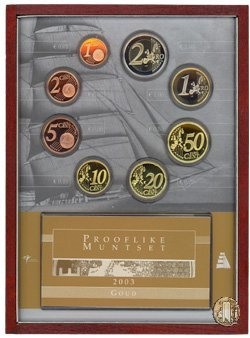 2003 Versione: Fondo Specchio. Numero di monete: 8. Valori nominali: 2 e 1 Euro; 50, 20, 10, 5, 2, 1 Eurocent (prezzo di emissione in euro: 32,50). 2003 Muntmeesterset: "De Nederland" (Set mastri di zecca: "De Nederland") Versione: Fondo Specchio. Numero di monete: 8. Valori nominali: 2 e 1 Euro; 50, 20, 10, 5, 2, 1 Eurocent (prezzo di emissione in euro: 99,00). | |||||||||