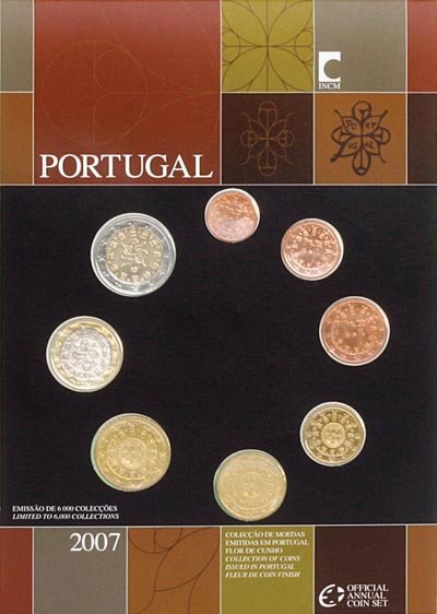 2007 Série Anual bebé: colecção de moedas emitidas em Portugal Flor de Cunho (Serie annuale babé: collezione di monete emesse in Portogallo Fior di Conio) Versione: Fior di Conio. Numero di monete: 8. Valori nominali: 2 e 1 Euro; 50, 20, 10, 5, 2, 1 Eurocent (prezzo di emissione in euro: 29,75) 2007 Série Anual: colecção de moedas emitidas em Portugal - BNC (Serie annuale: collezione di monete emesse in Portogallo - BNC) Versione: Fior di Conio. Numero di monete: 8. Valori nominali: 2 e 1 Euro; 50, 20, 10, 5, 2, 1 Eurocent (prezzo di emissione in euro: 34,51). 2007 Série Anual: colecção de moedas emitidas em Portugal Flor de Cunho (Serie annuale: collezione di monete emesse in Portogallo Fior di Conio) Versione: Fior di Conio. Numero di monete: 8. Valori nominali: 2 e 1 Euro; 50, 20, 10, 5, 2, 1 Eurocent (prezzo di emissione in euro: 21,42). | |||||||||||