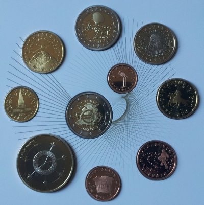 La divisionale oltre le 8 monete, da 1 cent ai 2 euro, sono presenti altre 2 monete: 2 euro commemorativi "10 anni di banconote e monete in euro"