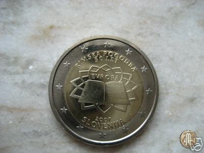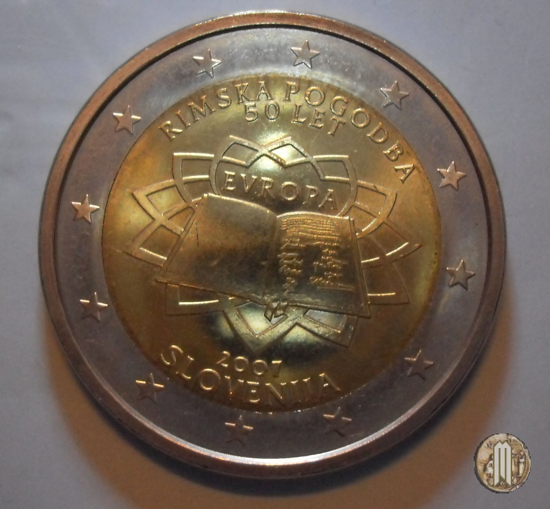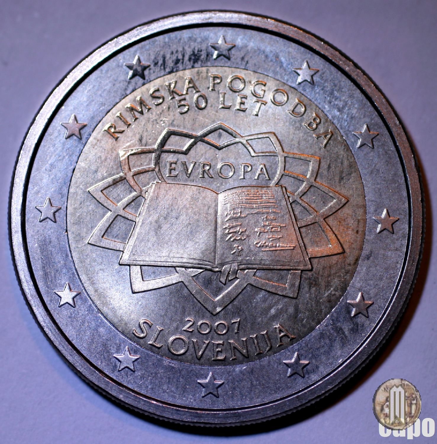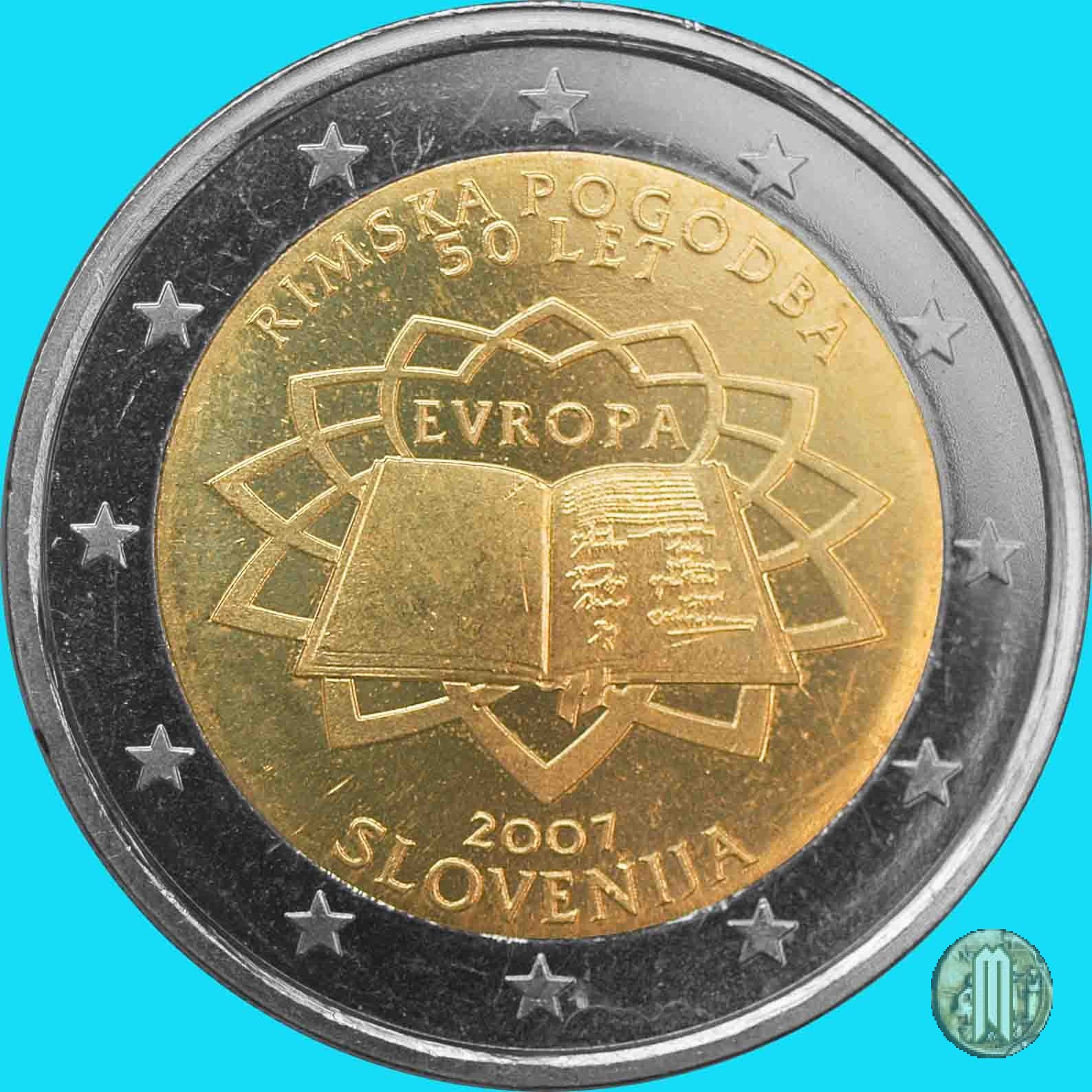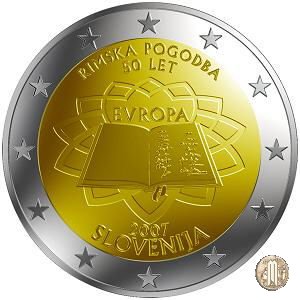 Al centro della moneta il trattato firmato dai sei Stati membri fondatori, sormontato dalla parola "EVROPA"; sul fondo la pavimentazione, disegnata da Michelangelo, di Piazza del Campidoglio a Roma dove sono stati firmati i Trattati il 25 marzo 1957. In basso, il millesimo di conio "2007" con sotto la scritta "SLOVENIJA". In alto, su due righe, "RIMSKA POGODBA/50 LET". Intorno le 12 stelle simbolo dell'UE.