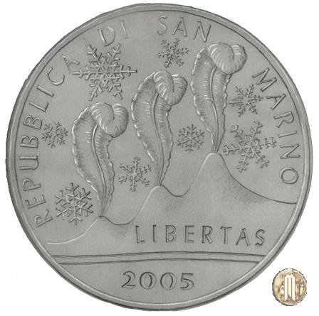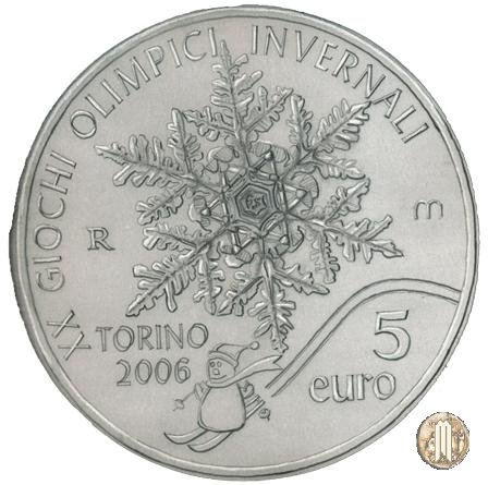 Le tre Torri stilizzate con pennacchio su uno sfondo di fiocchi di neve stilizzati, attorno la legenda "REPUBBLICA DI SAN MARINO"; sotto le tre torri stilizzate la scritta "LIBERTAS", due righe in senso orizzontale, sotto le quali l'anno di emissione "2005". Al centro l'immagine stilizzata di un fiocco di neve, sotto un pupazzo di neve con gli sci, dietro il quale due righe che rappresentano la scia. In tondo la scritta "XX GIOCHI OLIMPICI INVERNALI", sul lato sinistro la scritta "TORINO 2006", sul lato destro, sotto la scia, il valore "5", la scritta "euro". Completano la moneta, a sinistra il simbolo della Zecca Italiana che ne ha curato la coniazione "R", a destra il simbolo "m"che indica l'autore del bozzetto, Roberto Mauri.