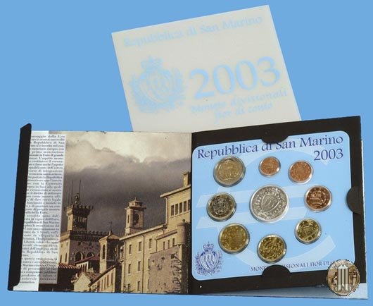 2003 Versione: Fior di Conio. Numero di monete: 9. Valori nominali: 5, 2 e 1 Euro; 50, 20, 10, 5, 2, 1 Eurocent (prezzo di emissione in euro: 40,00). | |||||||||||