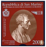 Questa emissione è dedicata al centenario delle celebrazioni in ricordo di Bartolomeo Borghesi, personaggio di rinomata cultura. Famoso epigrafista il Borghesi si guadagnò la stima degli storici del suo tempo, ma egli fu soprattutto profondo cultore di Numismatica, raggiungendo in tal campo rinomanza europea per aver dettato i canoni scientifici della disciplina numismatica. Fu socio di numerosissime Accademie d'Europa tra cui la famosa Accademia dei Lincei, ma il piú manifesto segno dell'ammirazione per il Borghesi si vide subito dopo la sua morte, quando l'Imperatore Napoleone III ne dispose la pubblicazione di tutti gli scritti, esprimendo con ciò il supremo omaggio al genio dello studioso. Le opere furono stampate a Parigi nella lingua originale dell'autore e si dividono in cinque serie tra cui le Opere Numismatiche. Nell'aprile del 1821 il Borghesi si trasferí nella Repubblica di San Marino e per motivi politici decise di prendere stabile dimora nella quiete della piccola Repubblica per la quale rinunciò alla cittadinanza pontificia, a cattedre e ad uffici. I Sammarinesi a dimostrazione della stima per il suo talento lo chiamarono a fare parte del massimo organismo legislativo, il Consiglio Principe e Sovrano e nel 1830 lo elessero definitivamente Segretario di Stato per gli Affari Esteri, carica che mantenne per 21 anni. Decreto 16 Dicembre 2004 n° 171 Corso Legale: 16 Dicembre 2004 | |||||||||