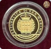 Elementi ispirati a decorazioni dell'arte bizantina, al centro delle quali sono rappresentati lo stemma con la corona, il ramo di alloro, il ramo della quercia e sotto la scritta "LIBERTAS". In tondo la scritta "REPUBBLICA DI SAN MARINO".1