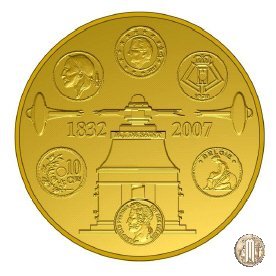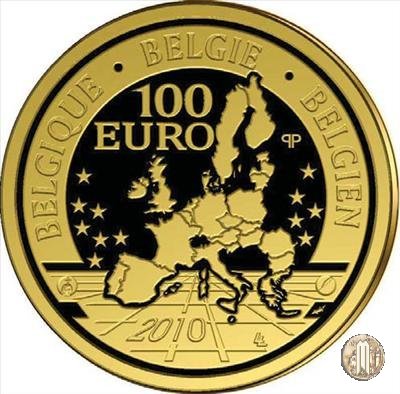 100 Euro 2007 175° di Regno della Dinastia Dritto: Stampa a vite del capo tecnico della zecca dell'epoca, J.Desaint, pressa grazie alla quale furono prodotti i primi pezzi belgi. Attorno sei monete che rappresentano il regno dei sei sovrani. Verso: Cartina dell'Europa. | |