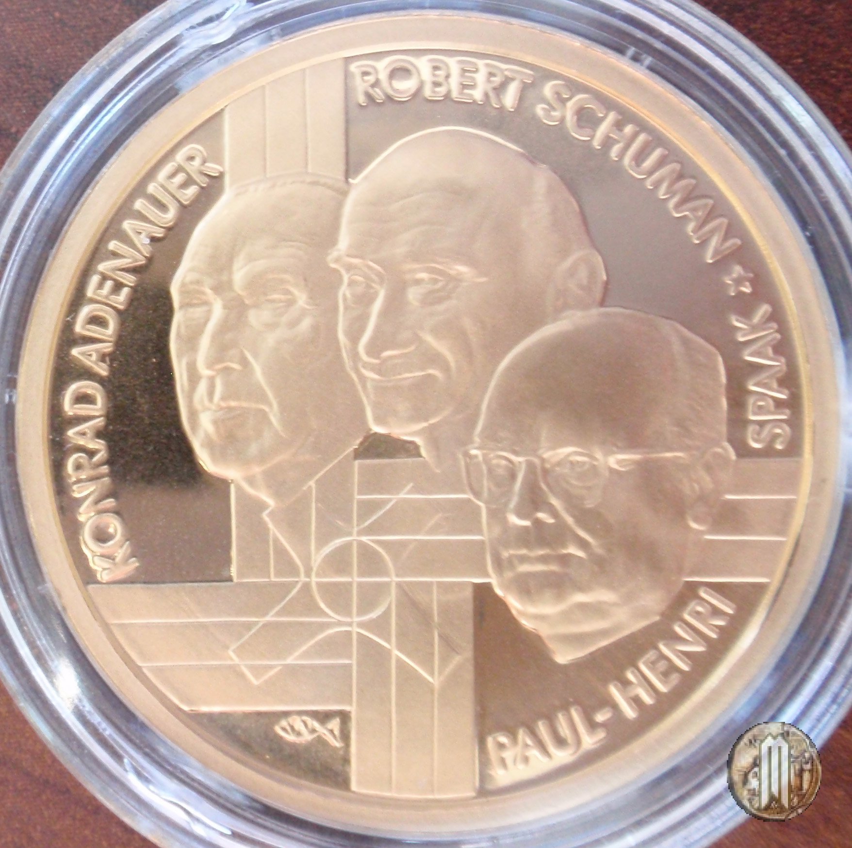 100 Euro 2002 Fondatori della UE Dritto: Ritratti di Konrad Adenauer, Robert Schuman e Paul_Henri Spaak padri fondatori della CECA (Comunità Europea del Carbone e dell'acciaio) nel 50° anniversario della sua fondazione. La CECA è il primo organismo Europeo che ha poi portato all'Unione Europea. Verso: Cartina dell'Europa. | |