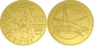 100 Euro 2008 Cinquantenario Expo '58 Dritto: La Freccia del Genio Civile la cui punta si confonde con una delle punte della stella che forma il logo dell'Esposizione Universale. Nel cinquantenario dell'Expo del 1958. Verso: Cartina dell'Europa. | |