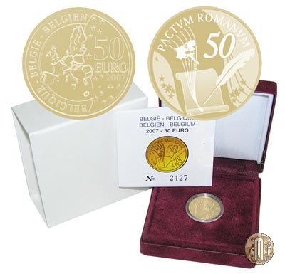 50 Euro 2007 Cinquantenario dei Trattati di Roma Dritto: Cinquantenario del Trattati di Roma del 25 marzo 1957 che diedero vita alla Comunità Economica Europea. Verso: Cartina dell'Europa. ![]() ![]() | |