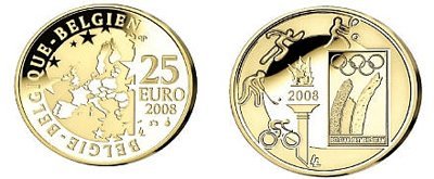 25 Euro 2008 Giochi Olimpici di Pechino Dritto: Logo della Squadra Olimpica Belga, Fiamma Olimpica e 4 pittigrammi rappresentanti altrettanti sport popolari: hockey, ciclismo, tennis e atletica. Verso: Cartina dell'Europa. | |