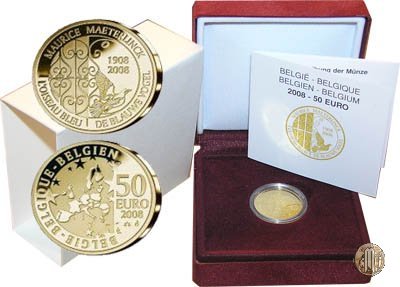 50 Euro 2008 Maurice Maeterlinck Dritto: "L'uccello Blu" (L'Oiseau Bleau) pezzo del teatro simbolico scritto nel 1908 da Maurice Maeterlinck (1862-1949), premio Nobel per la letteratura nel 1911. ![]() ![]() Verso: Cartina dell'Europa. | |