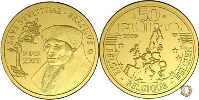50 Euro 2009 500° L'Elogio della Follia Dritto: Ritratto dell'Umanista Erasmo da Rotterdam (1466-1536), la cui opera principale è "L'Elogio della Follia". Iscrizioni: LAUS STULTITIAE - ERASMUS ![]() ![]() Verso: Cartina dell'Europa. Iscrizioni: BELGIE - BELGIQUE - BELGIEN 50 EURO 2009 | |