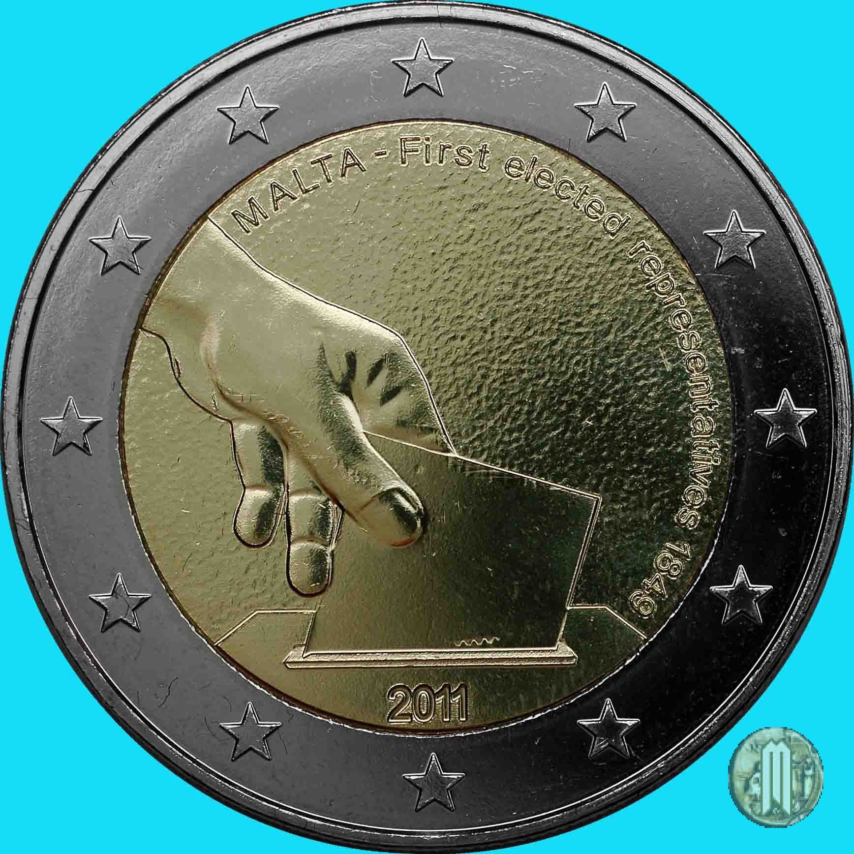 2 Euro 2011 Prime Elezioni Rappresentative Maltesi Dritto: Nel mezzo una mano che deposita una scheda elettorale in unurna; in alto ad arco la scritta MALTA First elected representatives 1849; in basso il millesimo di conio 2011. Autore: Gianni Bonnici. E la prima di una pentaserie che commemora eventi importanti nella storia costituzionale di Malta. |