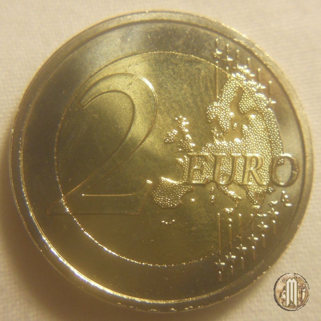 2 Euro 2009 10°Anniversario dell'EMU Dritto: Al centro della moneta è incisa una figura stilizzata che si fonde nel simbolo dell'Euro. Essa intende esprimere l'idea che la moneta unica e quindi l'Unione economica e monetaria (UEM) rappresentano la fase culminante della lunga storia europea di integrazione commerciale ed economica. Sopra, ad arco, "MALTA". Sotto, sempre ad arco, "UEM 1999-2009", con sopra la firma dell'autore "ΓΣ". Rispettivamente a dx e sx della stella a ore 6 il segno della zecca di Utrecht (caduceo) e il simbolo del Direttore M. Brouwer (un veliero). Intorno le 12 stelle simbolo dell'UE. Verso: Faccia comune (NUOVO DISEGNO) |