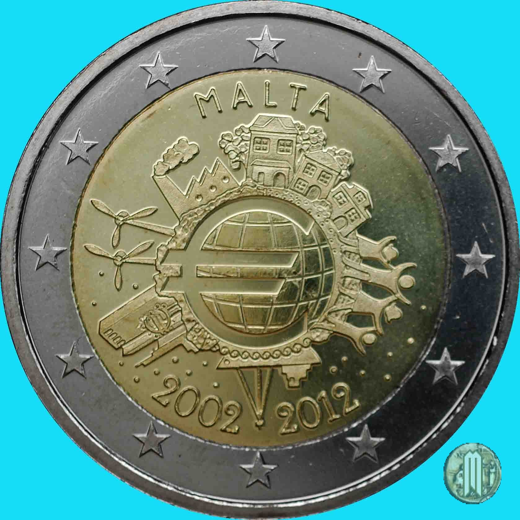 2 Euro 2012 10° Anniversario Euro Dritto: Al centro della moneta è posta una rappresentazione del simbolo dell'Euro. Ad incorniciare il simbolo, elementi che ne raffigurano la rilevanza in vari campi: la torre della B.C.E rappresenta il mondo finanziario; le stazioni eoliche rappresentano l'energia; le fabbriche rappresentano il settore industriale; le case e le persone rappresentano i popoli dei paesi aderenti all'Euro; la nave rappresenta il commercio. In alto, ad arco, la scritta «MALTA»; in basso, ad arco, le date «2002» e «2012»; intorno le dodici stelle dell'Unione Europea. Verso: Faccia comune, nuova mappa. |