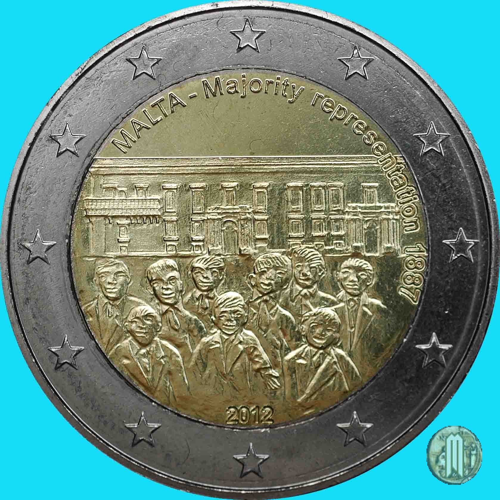 2 Euro 2012 Maggioranza rappresentativa 1887 Dritto: Al centro della moneta una folla festante con il Palazzo del Governatore, a La Valletta, sullo sfondo; in alto ad arco la scritta MALTA Majority representation 1887; in basso il millesimo di conio 2012. Autore: Gianni Bonnici. E la seconda di una pentaserie che commemora eventi importanti nella storia costituzionale di Malta. E inclusa nella Divisionale BU 2012 e in un Cofanetto FS. Emessa il 15 ottobre 2012 per commemorare la concessione ai maltesi nel 1887 di avere la maggioranza nellassemblea nazionale. |