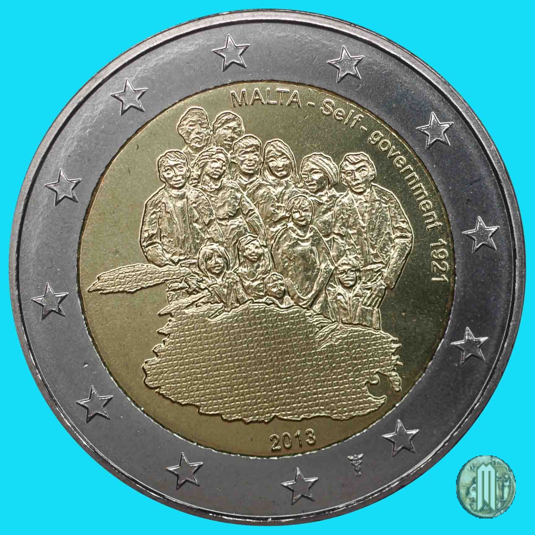2 Euro 2013 Governo autonomo 1921 Dritto: Al centro della moneta (); in alto ad arco la scritta MALTA Self-government 1921; in basso il millesimo di conio 2013. Autore: Gianni Bonnici. E la terza di una pentaserie che commemora eventi importanti nella storia costituzionale di Malta. |
